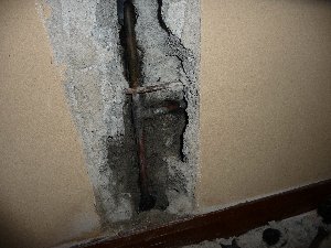 現場を見ると浴室付近からの漏水でした。浴室内の壁を壊すと修復費用がかかるので新たに浴室配管をすることになりました。漏水箇所をピンポイントで修理することを優先していますが状況によります。