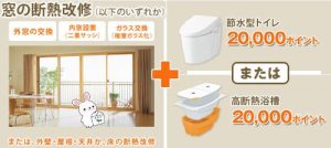 ※「窓の断熱改修」や「外壁、屋根・天井または床の断熱改修工事」とともに、「節水型トイレ」や「高断熱浴槽」を設置した場合、申請することで20,000ポイントがもらえます。