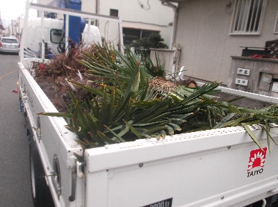 チェーンソーで木を切りながら、ユニック車で木を持ち上げて何とか撤去できました。