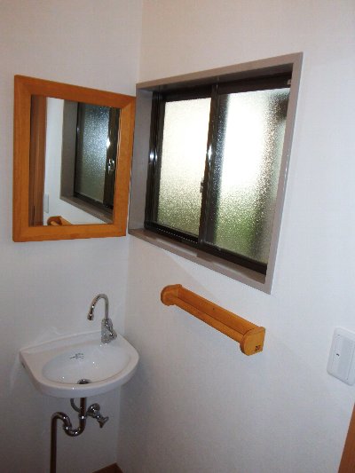 4 工事後 手洗いと素敵な鏡、タオル掛けがつきました。