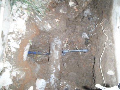 画面下が排水マスで給水配管を分岐した配管がマスの下に入ってます