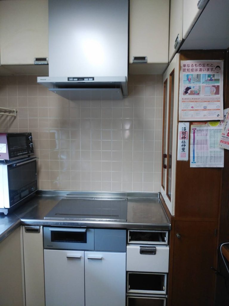 お掃除のしやすさと安全性を考慮してIHコンロにすることとなりました。オーブンは現在は使用していないとのことで収納スペースとすることとし、プロペラ型の換気扇をIHコンロと連動して動くノンフィルター型のレンジフードに取替いたしました。
