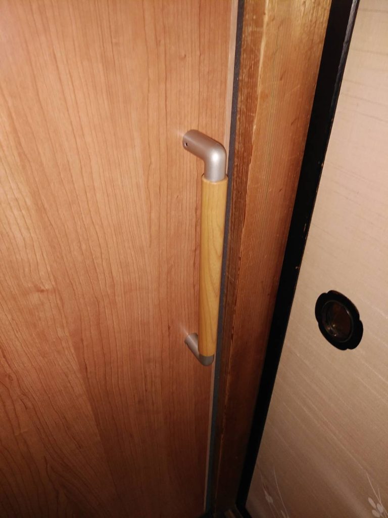 さらに敷居には金属のレールを入れて。。把手はハンドルタイプ。