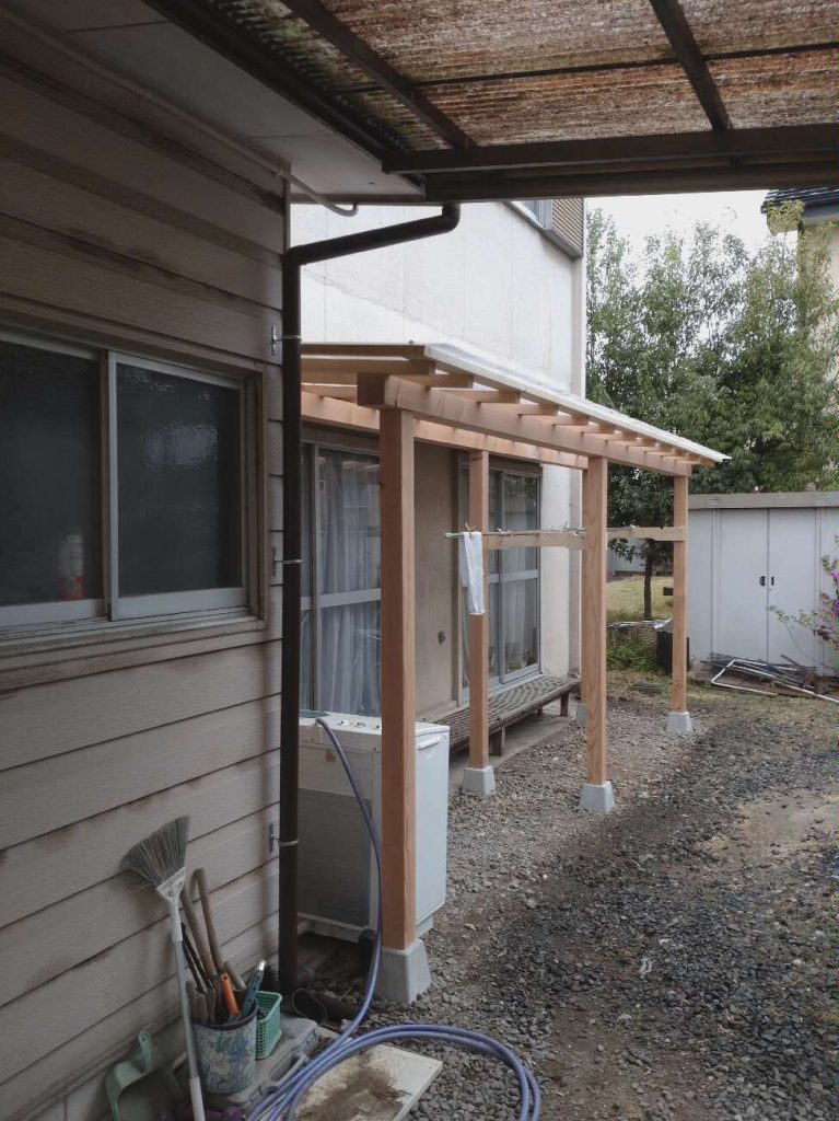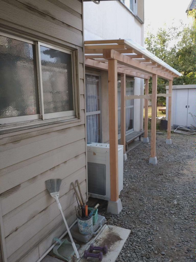 工事開始です。 現調時は軒先の材料をアルミや鉄骨でご提案もさせていただきましたが、使い勝手に合わせてお客様が部品を取り付けやすくなることや、工事費を抑えられることから木製になりました。