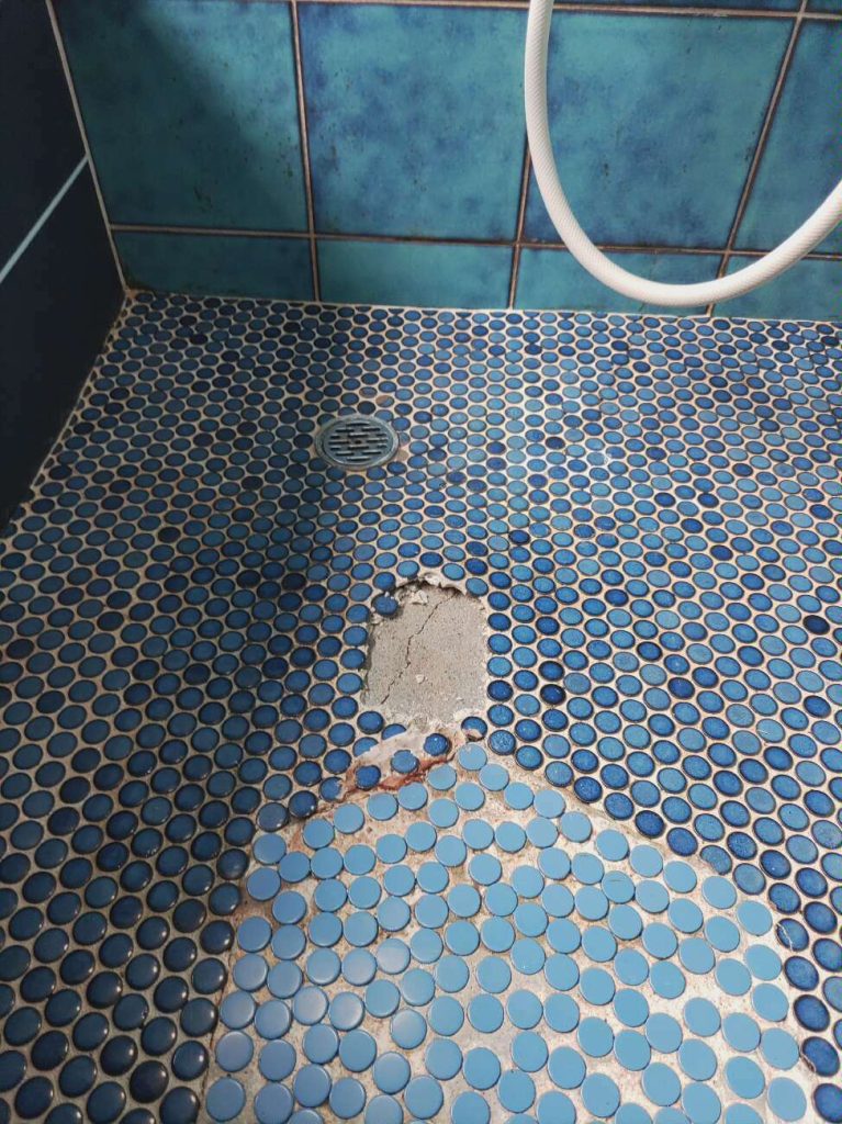 早速、現調にお伺いしたところ床のタイルが剥がれて洗い場の床全体のタイルが浮いている状況でした。一度、修理を行った形跡がありましたが年数が経つにつれて水が回ってしまったようです。
