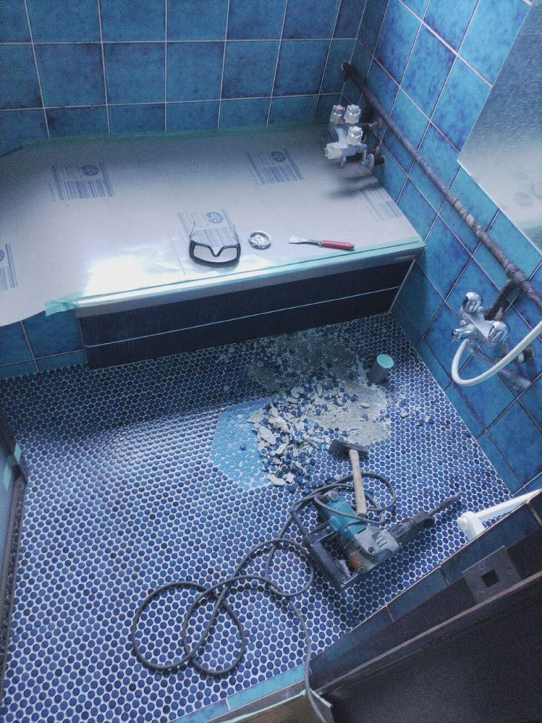 今回の浴室の工事は、当社のチラシを見て連絡いただいたお客様ですが、浴室の床のタイルが剥がれてしまいご相談いただきました。