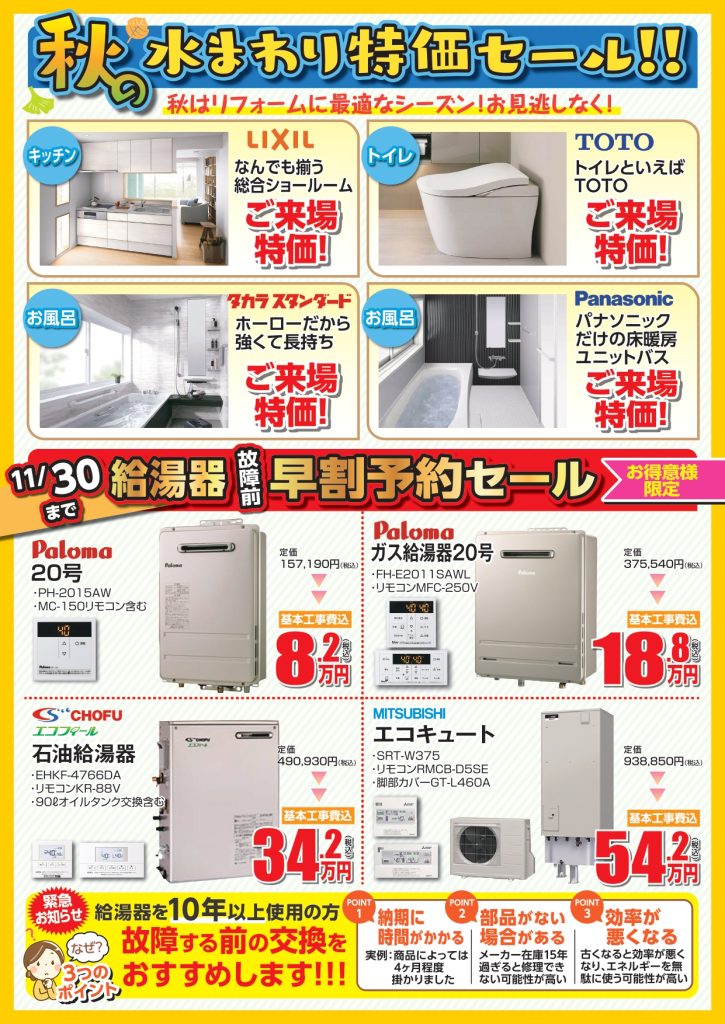 ただいま給湯器各種早割中ですのでお気軽にご連絡ください。