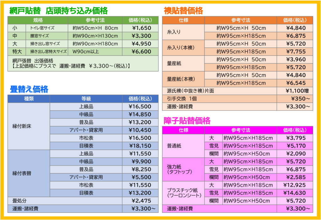 リフォームのふるやでは下記の内容で 網戸・襖・畳・障子 も対応しております。(2023年11月06日現在)
